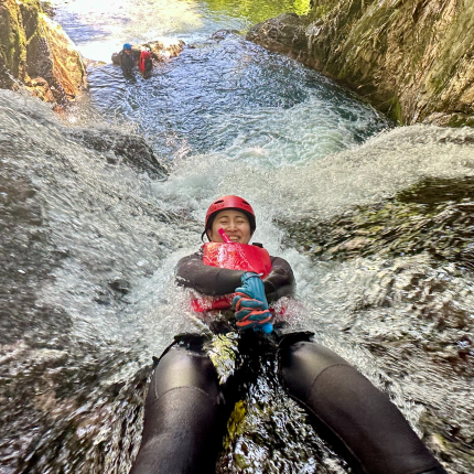 コンボツアーの冒険の1つは、山奥で行う渓谷を利用したキャニオニングと呼ばれるアクティビティ。滝をくだったり滑ったり、飛び込み体験ができ、大自然の中で思う存分楽しんでいただけます!